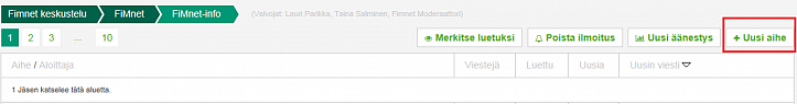 Kirjaudu FimnetiinSiirry yläpalkista kohtaan ”Keskustelu”Valitse haluamasi taulu ja klikkaa (esim. ”Fimnet-info”)Sivun yläreunasta valitse ”+Uusi aihe”Kirjoita aiheelle otsikko kohtaan ”aihe” ja viestisi sen alapuolelleLähetä